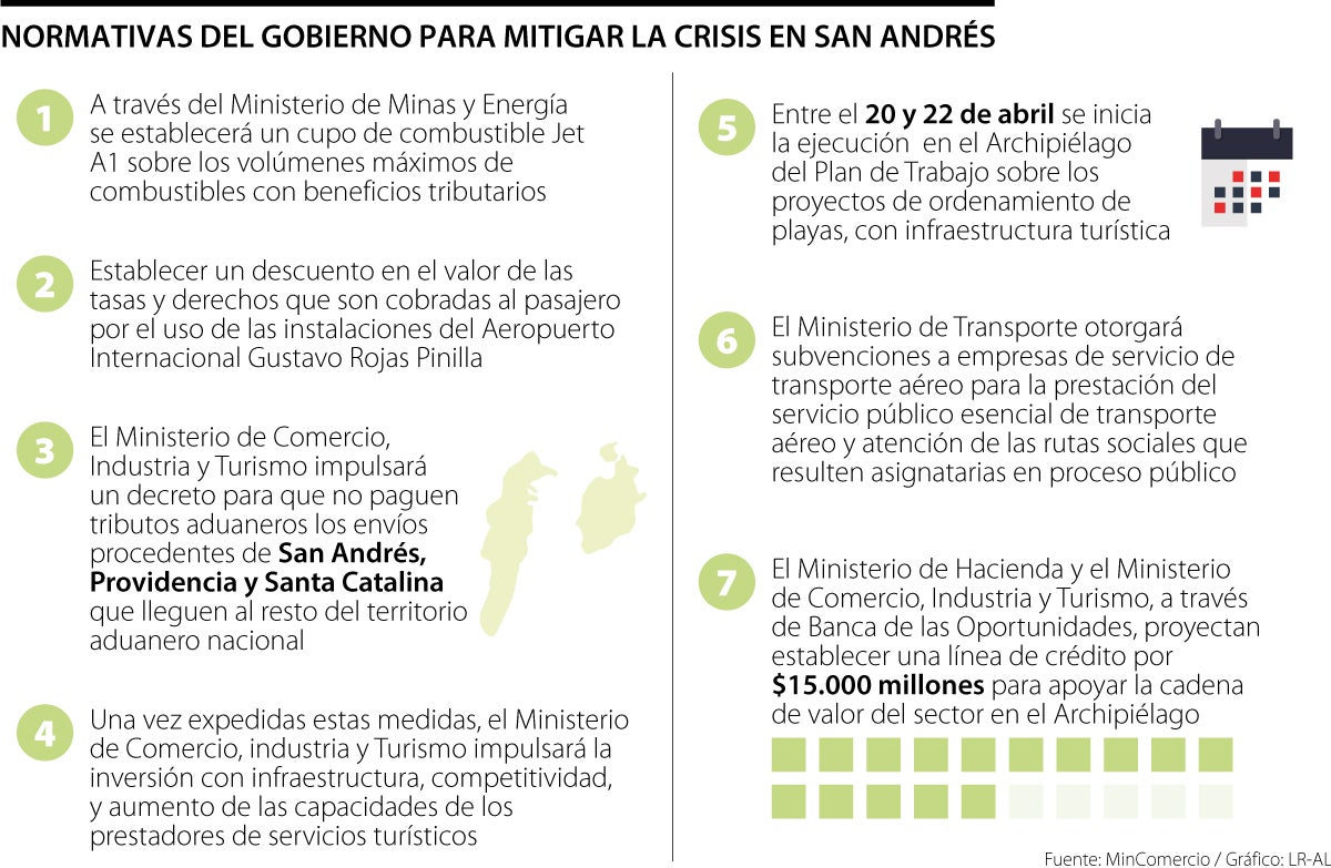 El efecto de la crisis de las aerolíneas low cost tocó a San Andrés, que en Semana Santa registró una ocupación de menos de 30%. Es por ello que el Gobierno, en cabeza del Ministerio de Comercio, Transporte, Hacienda, del Interior y Minas y Energía, entregó una serie de medidas con las que pretende ayudar a mitigar la crisis social, económica y de conectividad aérea que atraviesa la isla.