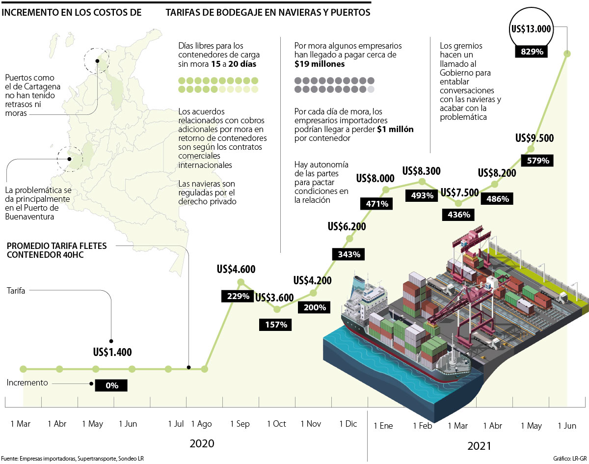 Cálculos hechos por estos importadores muestran que tan solo entre abril y mayo el precio aumentó 343 puntos porcentuales, pasando de US$8.200 a US$13.000 por cada contenedor de 40 HC. Al observar el incremento histórico desde finales del año pasado, el incremento, dijeron parte de los afectados, es superior a 800%.