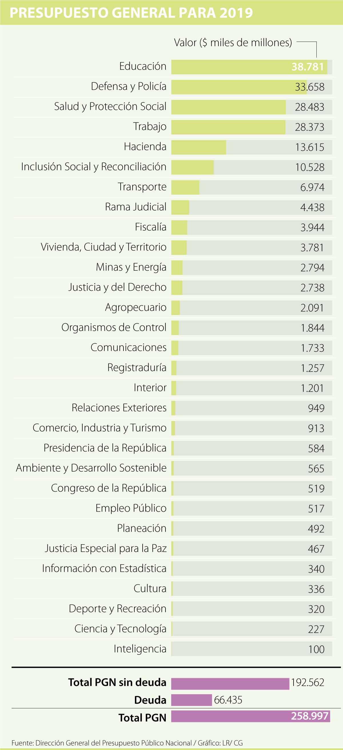 Ayer en el Congreso de la República se realizó la primera sesión de la discusión del proyecto de Presupuesto General de la Nación (PGN), el cual establece que los recursos de la Nación para el próximo año serán del orden de $258,9 billones, de los cuales $157,2 billones irán a funcionamiento, $66,4 billones a servicio de la deuda y $35,4 billones a inversión.