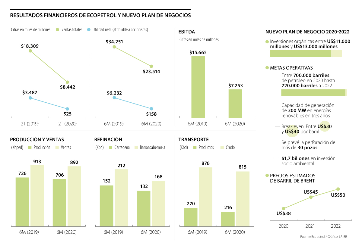 La crisis de los precios internacionales del petróleo, los choques externos por la débil demanda y los efectos colaterales de la pandemia le pasaron factura a Ecopetrol en el segundo trimestre del año. La petrolera reportó una caída en sus utilidades de 97,5% en el consolidado semestral, por lo que cerró con unas ganancias de $158.000 millones, las más bajas desde los últimos cinco años.