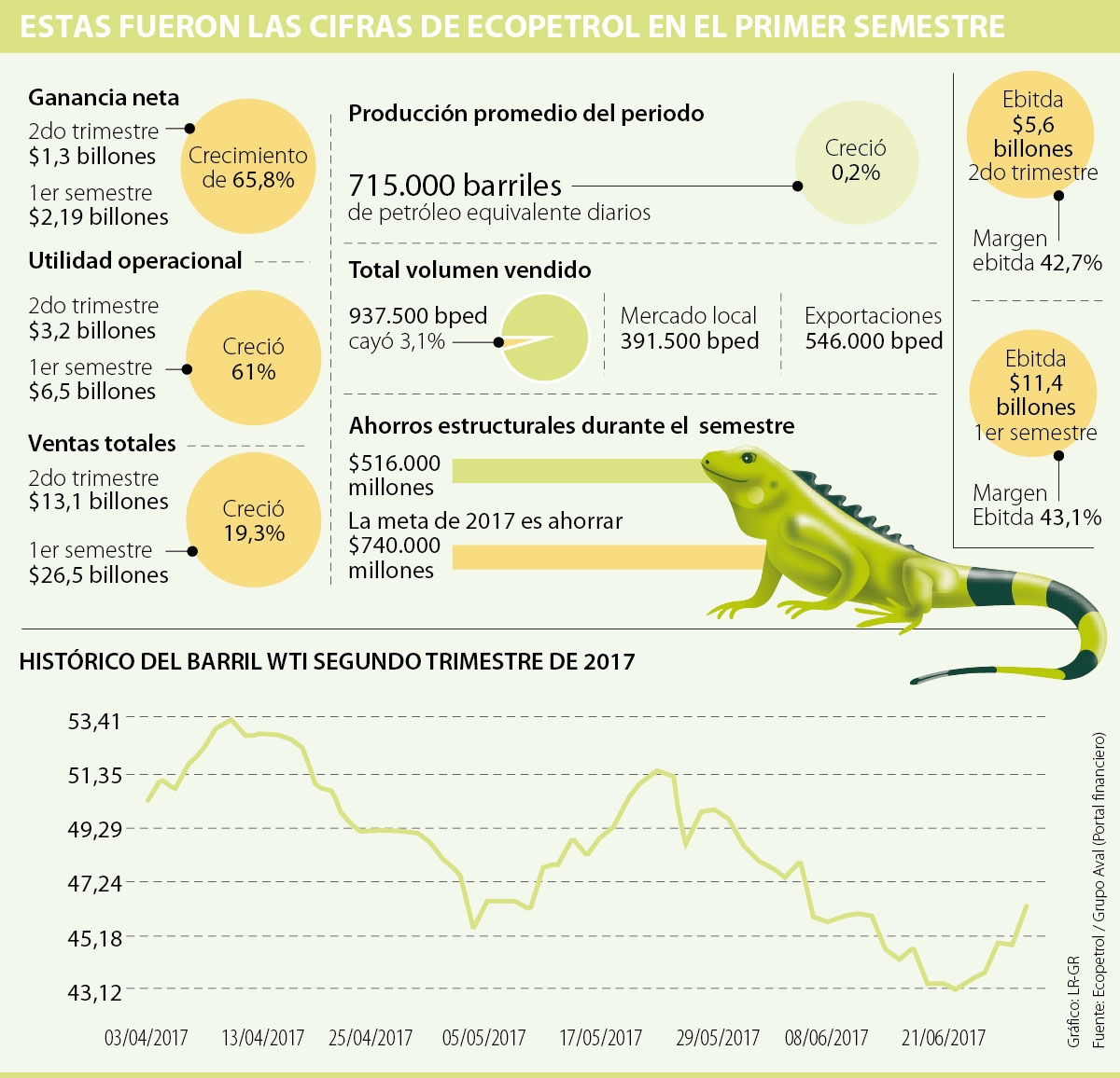 Esta vez los resultados superaron incluso, todo lo registrado durante 2016. El margen Ebitda del semestre se mantuvo en 43,1% durante lo corrido del año, un equivalente a US$30 barril. Para Juan Carlos Echeverry, presidente de la compañía, “es uno de los más altos de la industria”, dado que se cerró con una sólida posición de caja de $10,4 billones.