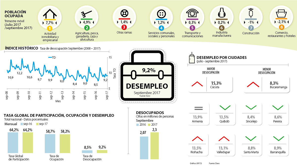El Departamento Administrativo Nacional de Estadística (Dane) presentó ayer el dato de mercado laboral para septiembre. El informe reveló que la tasa de desempleo se ubicó en 9,2%, siete puntos básicos por encima de la cifra registrada durante el mismo mes en 2016, demostrando un leve aumento. Un comportamiento que también pudo contraer el número de nuevos ocupados, que para septiembre llegó a 111.000.