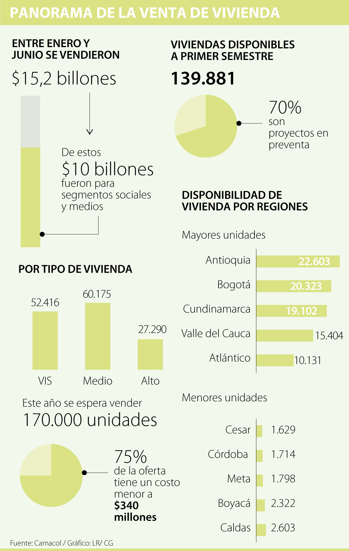 Consecuencia de ese proceso, se registraron en ese mismo periodo una oferta disponible de 139.881 viviendas, siendo Antioquia la región que tiene mayor oferta, con 22.603 unidades de vivienda; seguida de Bogotá, que tiene 20.323 viviendas para la venta.