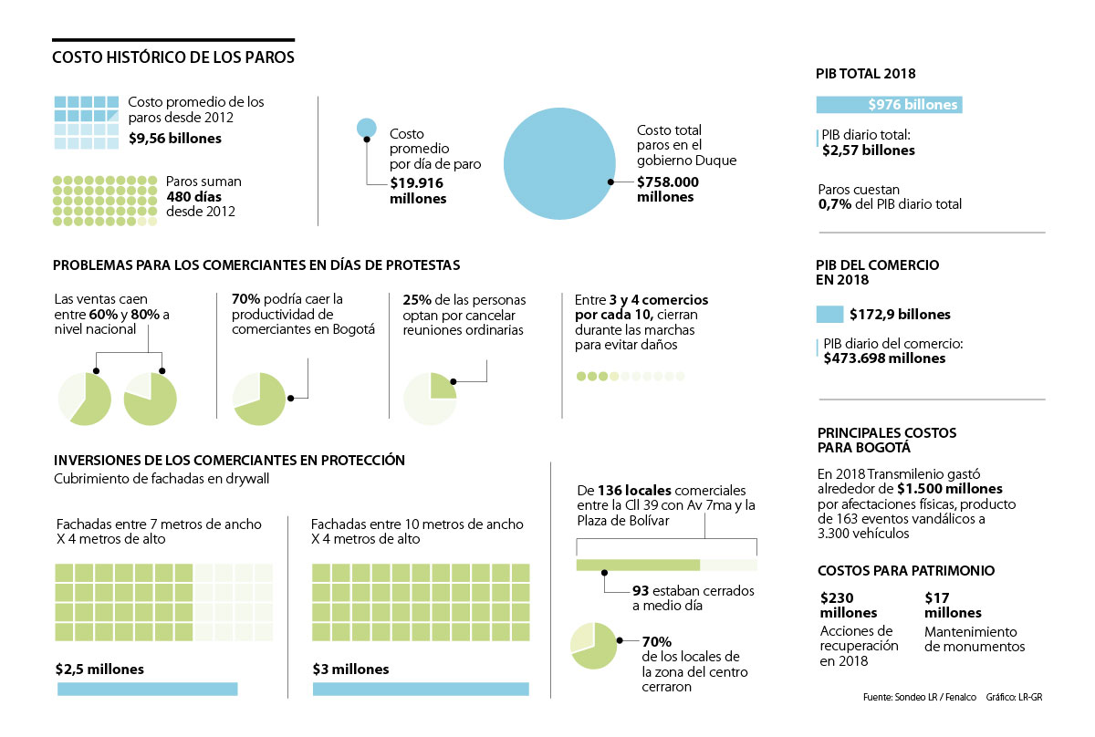 En ese momento, LR hizo un ejercicio en el que siguió las marchas desde la Calle 39 con Carrera Séptima (altura del Parque Nacional), hasta la Plaza de Bolívar. En este recorrido se contaron 136 locales comerciales, (entre bancos, tiendas de alimentos, mercados de todo tipo, almacenes de ropa, o hasta pequeñas cafeterías) y de estos 93 estaban cerrados al medio día. Es decir casi 70%. Al momento de hablar con empresarios y comerciantes, la mayoría hablaba de afectaciones en las ventas de hasta 80% en la jornada. Esta es la misma estimación que tiene Fenalco a nivel nacional, aunque Carlos Arturo Calle, gerente del grupo Arturo Calle, dijo que “en un día de manifestaciones las ventas se pueden reducir 90% dependiendo del sector”.