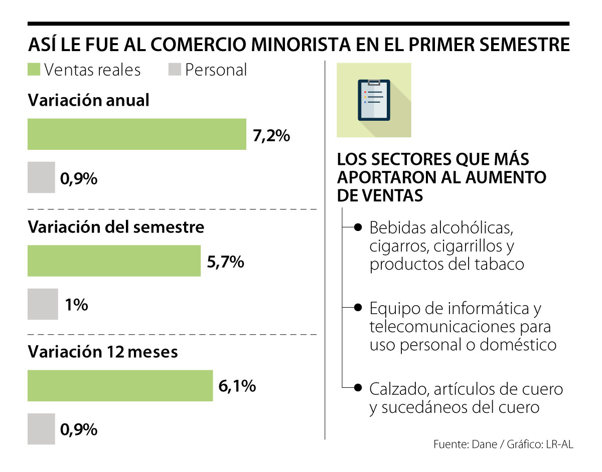 El Departamento Administrativo Nacional de Estadística (Dane) reveló que en el primer semestre del año las ventas del comercio minorista se elevaron 5,7% frente al mismo periodo del año pasado. La entidad aseguró que de las 16 líneas de mercancías, 15 registraron variaciones positivas en sus ventas reales.
