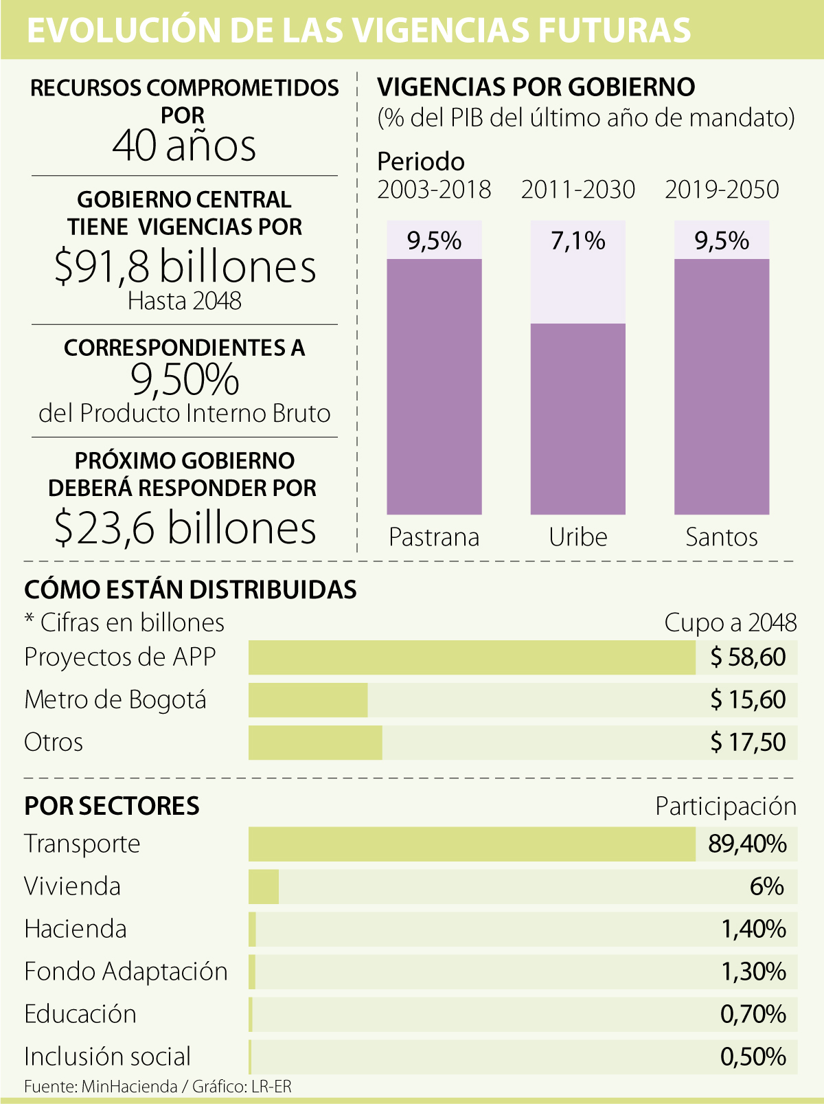 Como es habitual en las finanzas de los gobiernos, parte de los proyectos a realizar se hacen a partir de recursos comprometidos de las vigencias de los siguientes periodos. El Presidente que asuma desde el próximo 7 de agosto tendrá a su cargo el pago de vigencias futuras heredadas por $23,6 billones, las cuales se han ido acumulando, al menos, durante los tres últimos gobiernos.