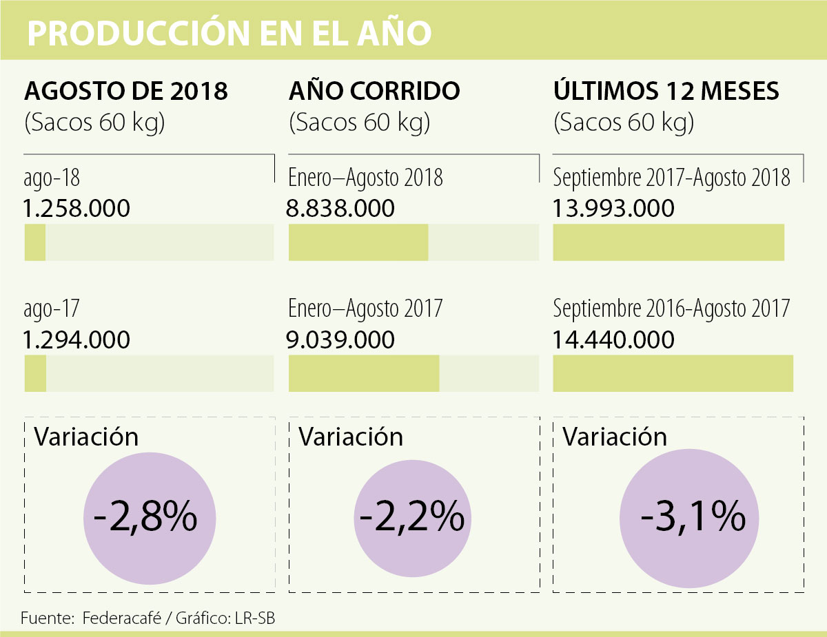 En relación con el volumen producido en lo corrido del 2018 (enero-agosto) fue de 8,8 millones de sacos de 60 kilos, un 2,2% menos frente a los 9,03 millones de sacos cosechados durante los ocho primeros meses de 2017, informó la FNC.