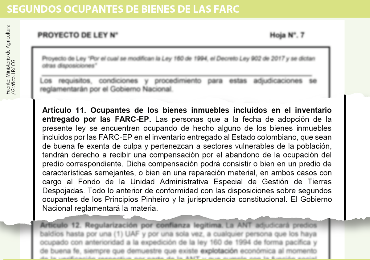 Una iniciativa que está definida en el artículo 11 del proyecto de ley y que da derecho a las personas exentas de culpa y en condiciones de vulnerabilidad que estén haciendo uso de las tierras incluidas por las Farc en su inventario de recibir un predio con características semejantes en otra ubicación o una reparación material. Esto, con cargo al Fondo de la Unidad Administrativa Especial de Gestión de Tierras Despojadas, para abandonar la ocupación.