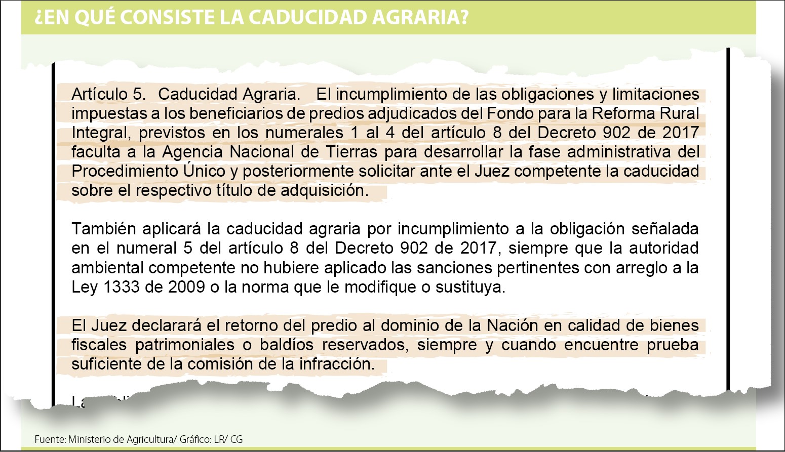 Condiciones que le darían mayor seguridad jurídica al Estado en caso que los beneficiarios de tierras o formalización, no hicieran un uso de buena fe de los predios. Fuentes cercanas al proyecto aseguran que la definición de la caducidad agraria era un vacío jurídico que tenía el decreto 902 de 2017, con el que se unificaron las reglas para acceder a la tierra.