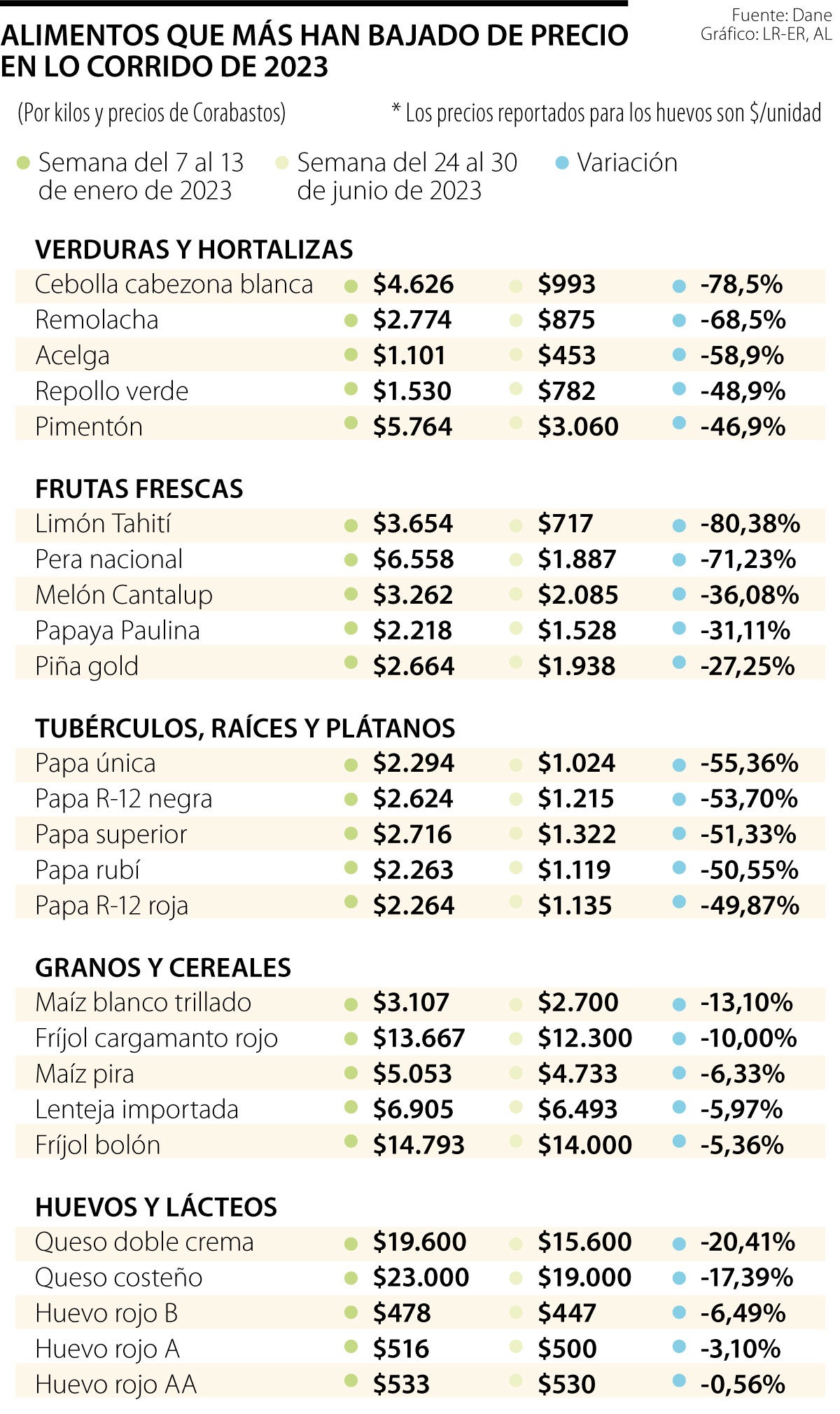 Continuando con el listado, se registran caídas en los precios de diferentes referencias de papa, yuca y plátano. También han caído los precios de granos como fríjol, arroz y garbanzo; así como de algunos tipos de carnes, quesos y huevo. (Ver gráfico)