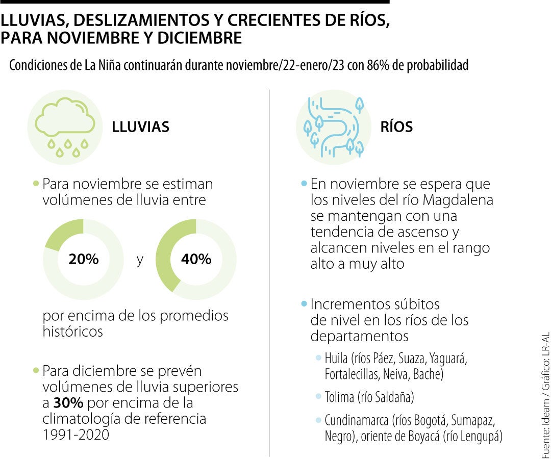 Yolanda González, directora del Ideam, explicó que ante la crítica situación, el comportamiento esperado de las variables meteorológicas para los próximos meses en Colombia no solo estará influenciado por el ciclo estacional típico de la época del año, sino también por la evolución de La Niña en lo que resta del 2022 y su retorno a una fase neutral en 2023.