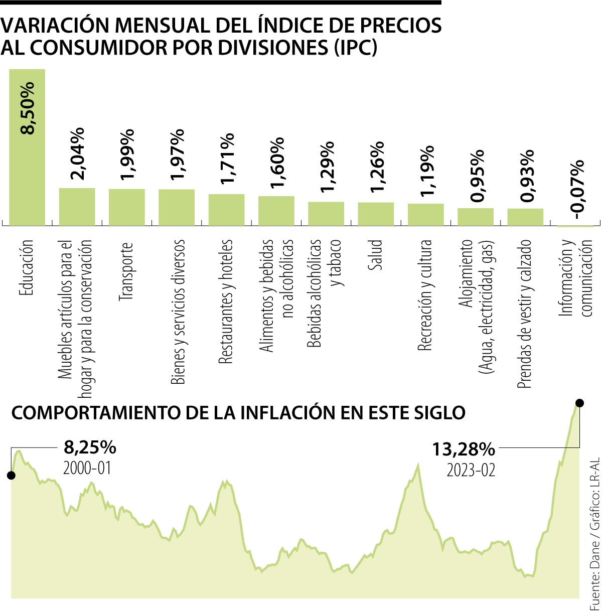 En el segundo mes del año, la variación anual del Índice de Precios al Consumidor (IPC) fue de 13,28% y dicho movimiento se explicó principalmente por la variación mensual de las divisiones de Educación con 8,50% y Muebles, artículos para el hogar y para la conservación ordinaria del hogar de 2,04%.