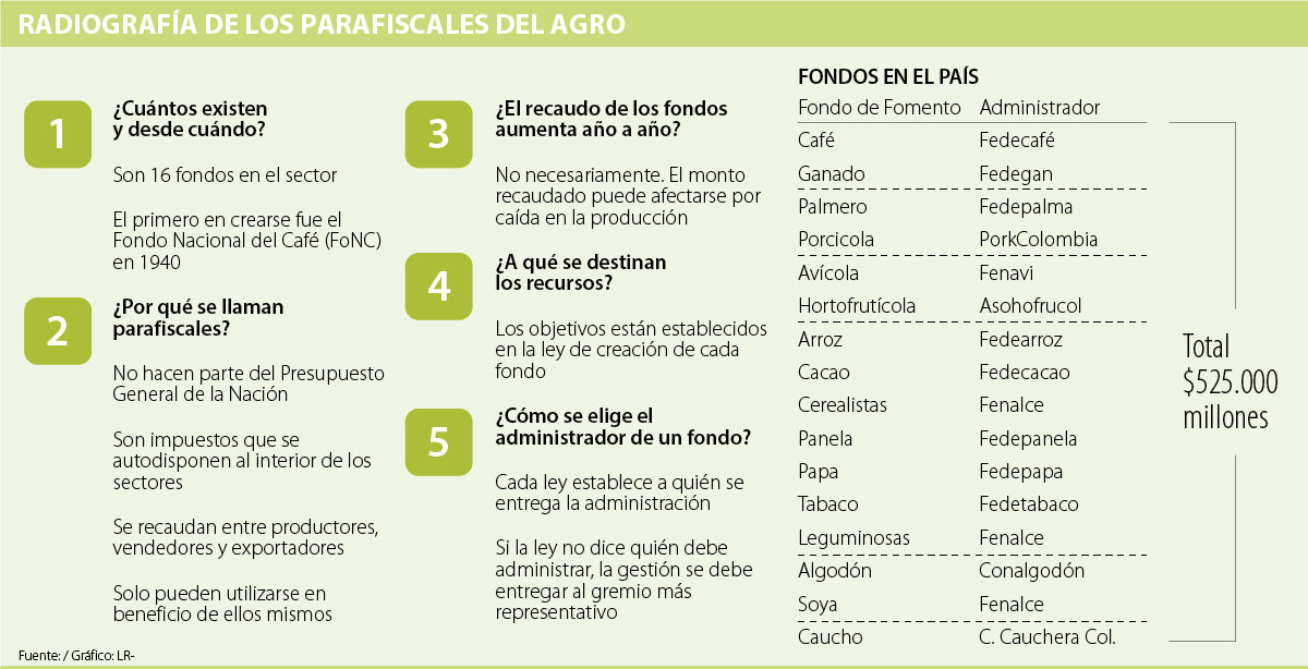 Enseguida se listan el Fondo Nacional del Ganado (FNG), cuyo recaudo asciende a unos $90.000 millones al año, que se destinan a salud animal, ciencia y tecnología y fomento del consumo, entre otros; y el Fondo Nacional Palmero (FNP), cuya gestión está en manos de la Federación Nacional de Cultivadores de Palma de Aceite (Fedepalma), presidida por Jens Mesa Dishington. Su fin son los programas de investigación y de apoyo en comercialización.