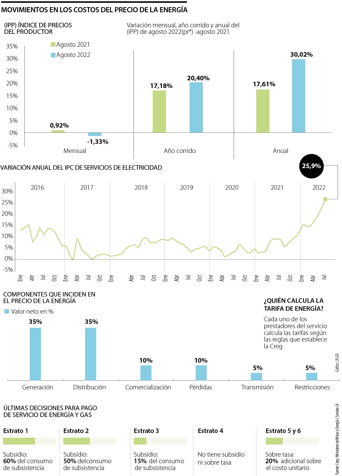 En el caso de la Creg, esta es libre de definir el monto de los aumentos en tarifas de la luz. Por esto, Alejandro Lucio, director de Optima Consultores, y Juan Carlos Echeverry, exministro de Hacienda, afirmaron que la comisión suele fijar sus alzas respecto al Índice de Precios al Productor (IPP) que llegó a 30% anual en el último mes. Es decir, la Creg puede subir o bajar los precios luego de revisar cuánto le cuesta a toda la cadena de la industria generar energía. “Este es un indicador que está alza y se encuentra por las nubes”, dijo Lucio, mientras que Echeverry agregó que es por dicha razón que los constantes aumentos en el precio tengan sentido.