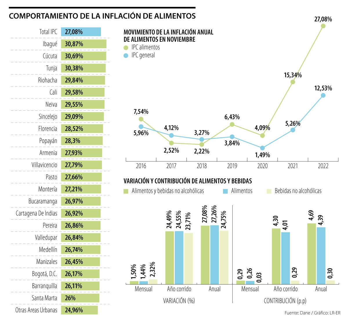 En otras principales como Medellín, Bogotá y Barranquilla los incrementos fueron 27,08%, 26,74% y 26,11% respectivamente. “En esta ciudades la demanda de alimentos es mayor a la media nacional por su densidad poblacional, pero la capacidad adquisitiva es mejor que en otras regiones, y eso ha hecho que no sean las capitales más afectadas por la inflación del sector”, agregó Carlos Duarte, analista de economía social de la Universidad Sergio Arboleda.