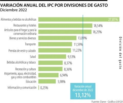 El Dane dio a conocer el registro de la variación anual del IPC para diciembre de 2022, el cual alcanzó un nivel histórico de 13,12%. Este aumento, sin precedentes en este siglo, se explica principalmente por la variación anual del sector de Alimentos y bebidas no alcohólicas, la cual tuvo un aumento de 27,81%. Es decir, aproximadamente un cuarto del comportamiento de la inflación en 2022 se explica por lo ocurrido en cuanto al sector de alimentos.
