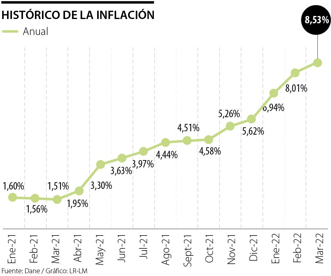 Desde agosto de 2016, cuando la inflación anual fue de 8,1% no se registraba una variación tan alta en los precios al consumidor. La cifra para marzo de 2022 fue de 8,53%, dato que muestra el aumento constante de la inflación, pues desde diciembre de 2021, cuando la variación anual fue de 5,62%, la cifra ha subido más de un punto porcentual cada mes.
