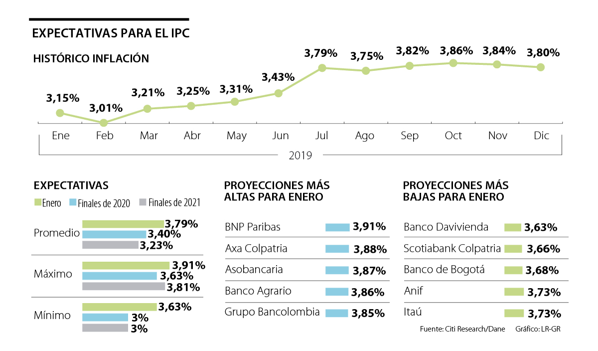 “Los componentes indexados a la inflación misma o el salario mínimo suelen presentar un nivel elevado, eso es fundamento de las proyecciones comenzando 2020, y no solo este año, sino incluso en otros. Ahora, tampoco podría ser más alta porque puede que temas como el de los precios de los alimentos no hayan sido tan fuertes como se esperaba por el tema de las heladas”, comentó el director de investigaciones económicas de Casa de Bolsa, Juan David Ballén.