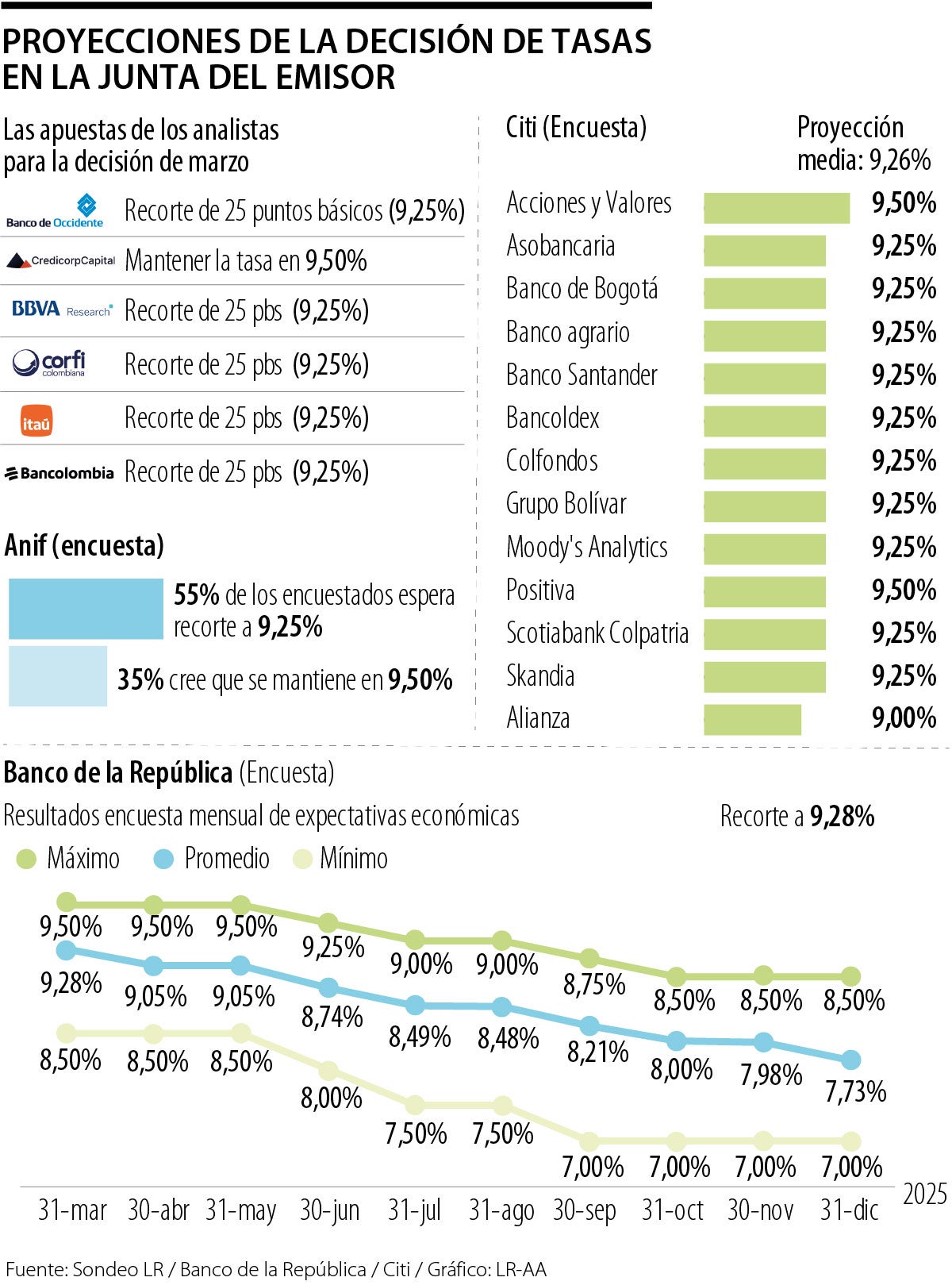 Según un sondeo realizado entre diversas entidades bancarias y centros de pensamiento, liderado por Anif, entre 80% y 85% de los expertos estiman que el Emisor optará por un recorte de 25 puntos básicos, llevando la tasa a 9,25%. Entre quienes prevén esta reducción se encuentran el Banco de Occidente, Bbva Research, Corficolombiana, Itaú y otros.
