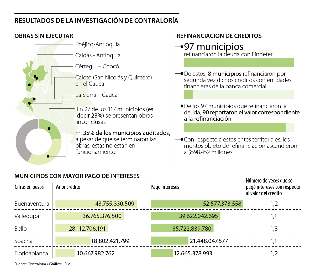 Según los datos del órgano de control, los créditos de los 117 municipios ascendieron a $440.637 millones. De estos, 108 municipios entregaron información financiera de créditos por $417.163 millones. La Contraloría destacó que sobre este último grupo se han efectuado pagos por concepto de intereses por $408.362 millones, lo que equivale a 97,8% del monto de los créditos; y por capital a $59.198 millones, lo que representa 14,2%.