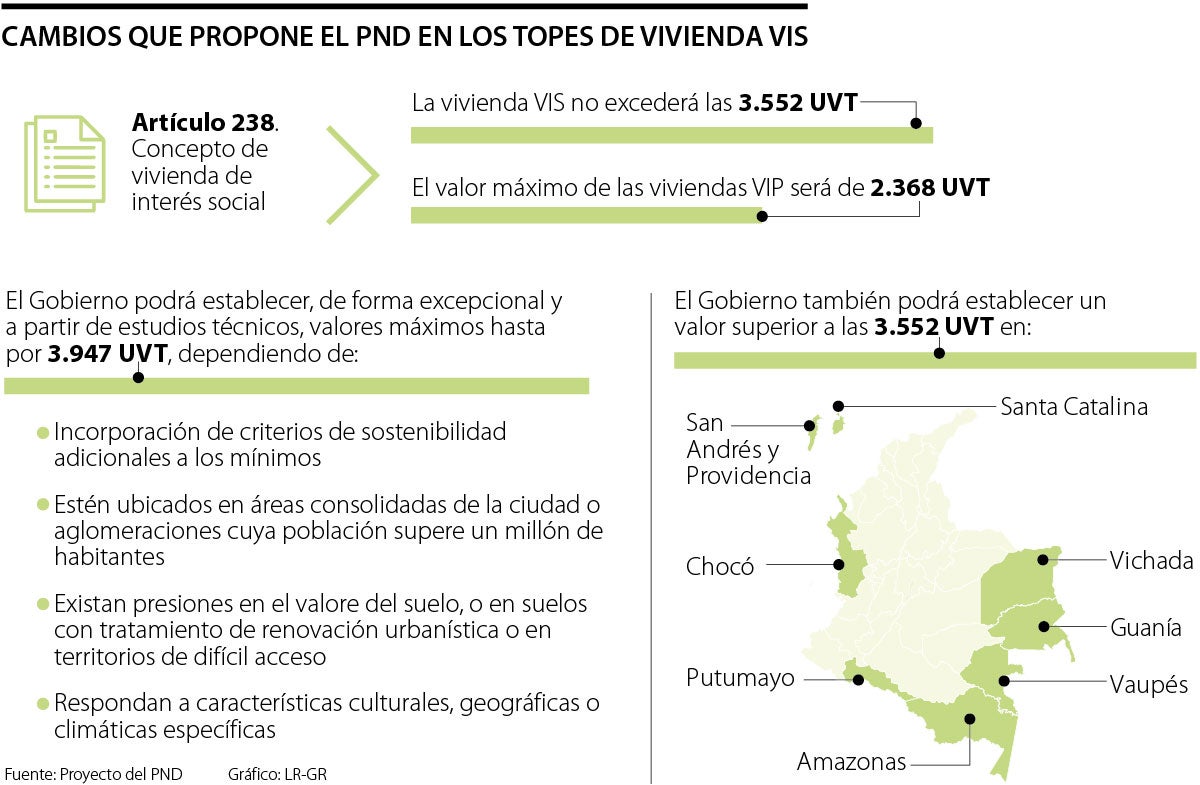 En el articulado, la Sección II define las políticas públicas para tener ‘territorios más humanos: hábitat integral’. Dentro de ellas, el Artículo 238 dice que aunque el tope de las viviendas de interés social (VIS) será de 3.552 UVT, mientras que el de las viviendas de interés prioritario (VIP) será de 2.368 UVT, el Gobierno podrá establecer, de manera excepcional y a partir de estudios técnicos, valores máximos hasta de 3.947 para este tipo de viviendas, dependiendo de ciertos factores.