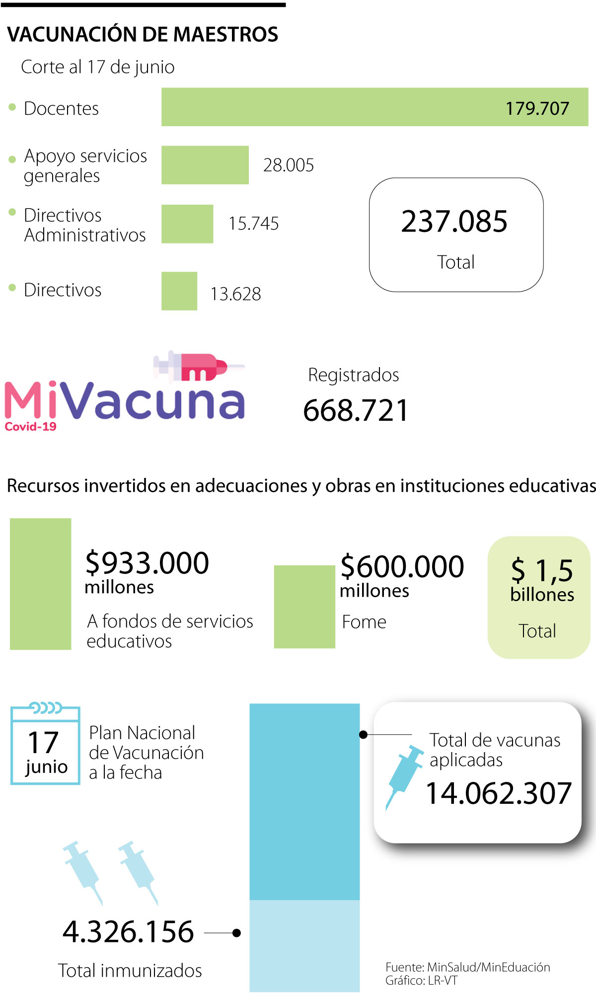 Cifras del Ministerio de Salud muestran que, con corte al 17 de junio, los vacunados en el grupo priorizado de docentes/directivos del sector educación son 237.085. De este grupo, 179.707 docentes han recibido el biológico, al igual que 13.628 directivos, 15.745 directivos administrativos y 28.005 personas que hacen parte de los equipos de apoyo y servicios generales. Estos últimos tienen 668.721 registrados en el portal MiVacuna. Desde el Ministerio de Educación estiman que la vacunación de todos los docentes del país finalizará antes del próximo 15 de julio.