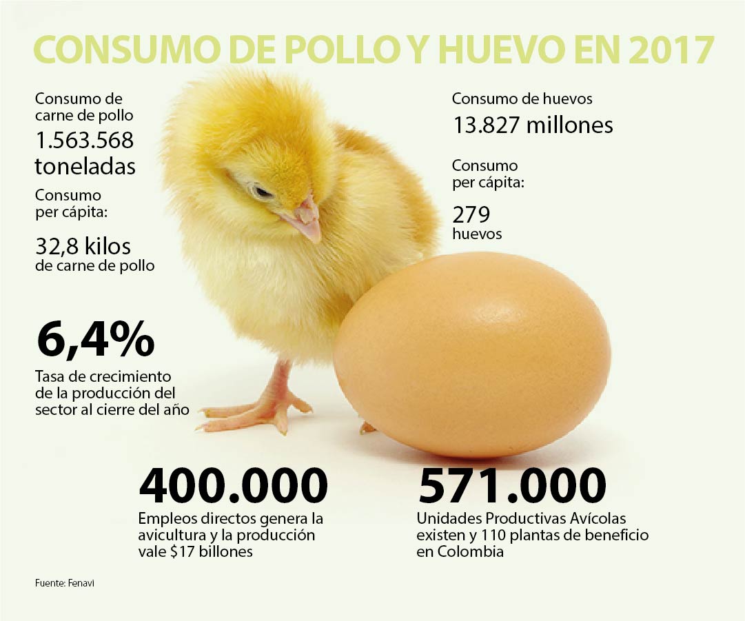 Una cifra que no solo sobrepasa la meta de la Federación, sino que le abre un buen camino al pollo y huevo para seguir ganando terreno en la mesa de los colombianos. Además, según información proporcionada por Fenavi, el crecimiento total del sector avícola, al cierre de 2017, fue de 6,4% en relación al mismo periodo de 2016, y el consumo de carne llegó a 1.563.568 toneladas.