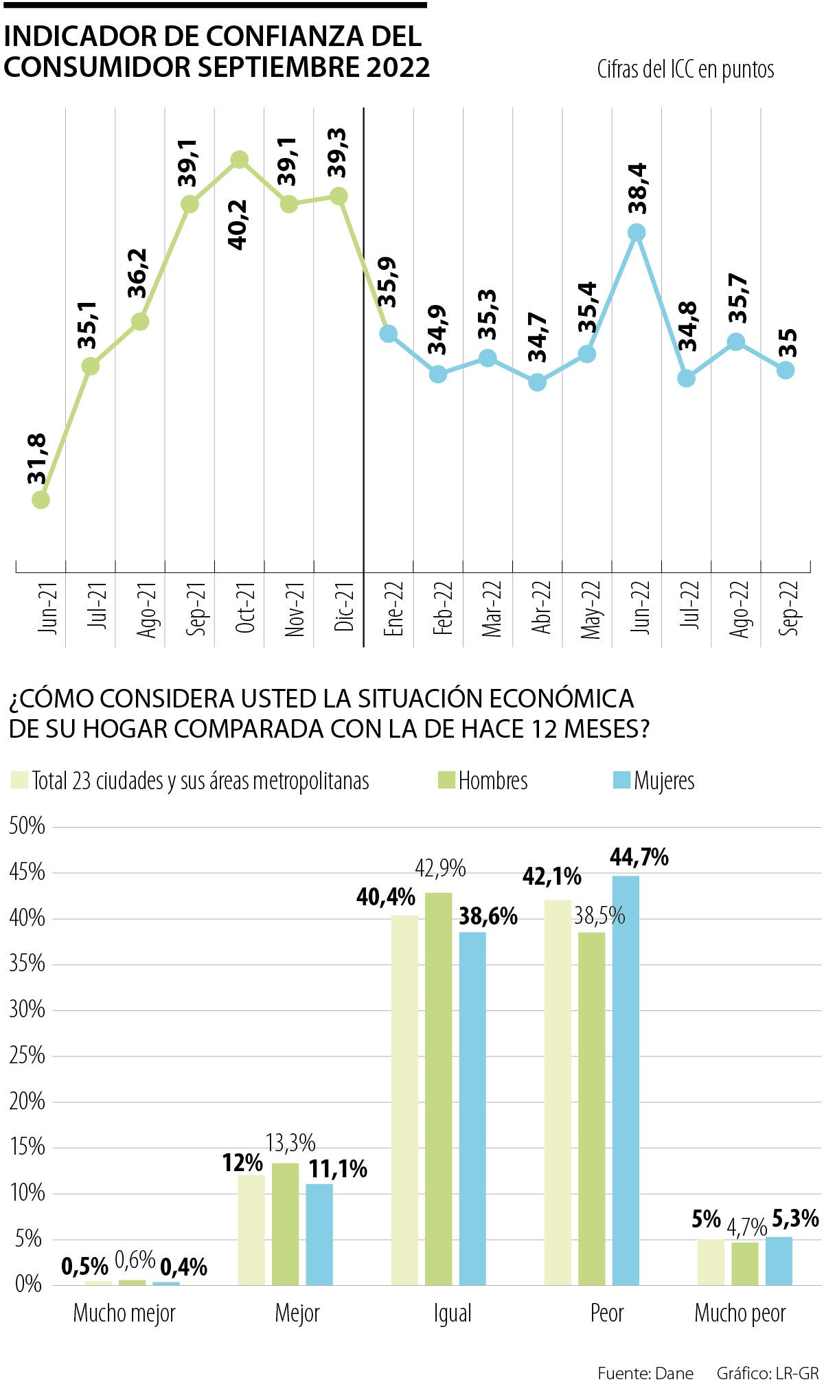 El Indicador de Confianza del Consumidor (ICC), por su parte, perdió el impulso que traía en agosto, cuando tras crecer nueve puntos versus julio, se ubicó en 35,7, pues para septiembre se contrajo 0,7 puntos y quedó en 35. Si se compara contra la cifra del mismo mes en 2021 (39,1), también hubo una contracción.