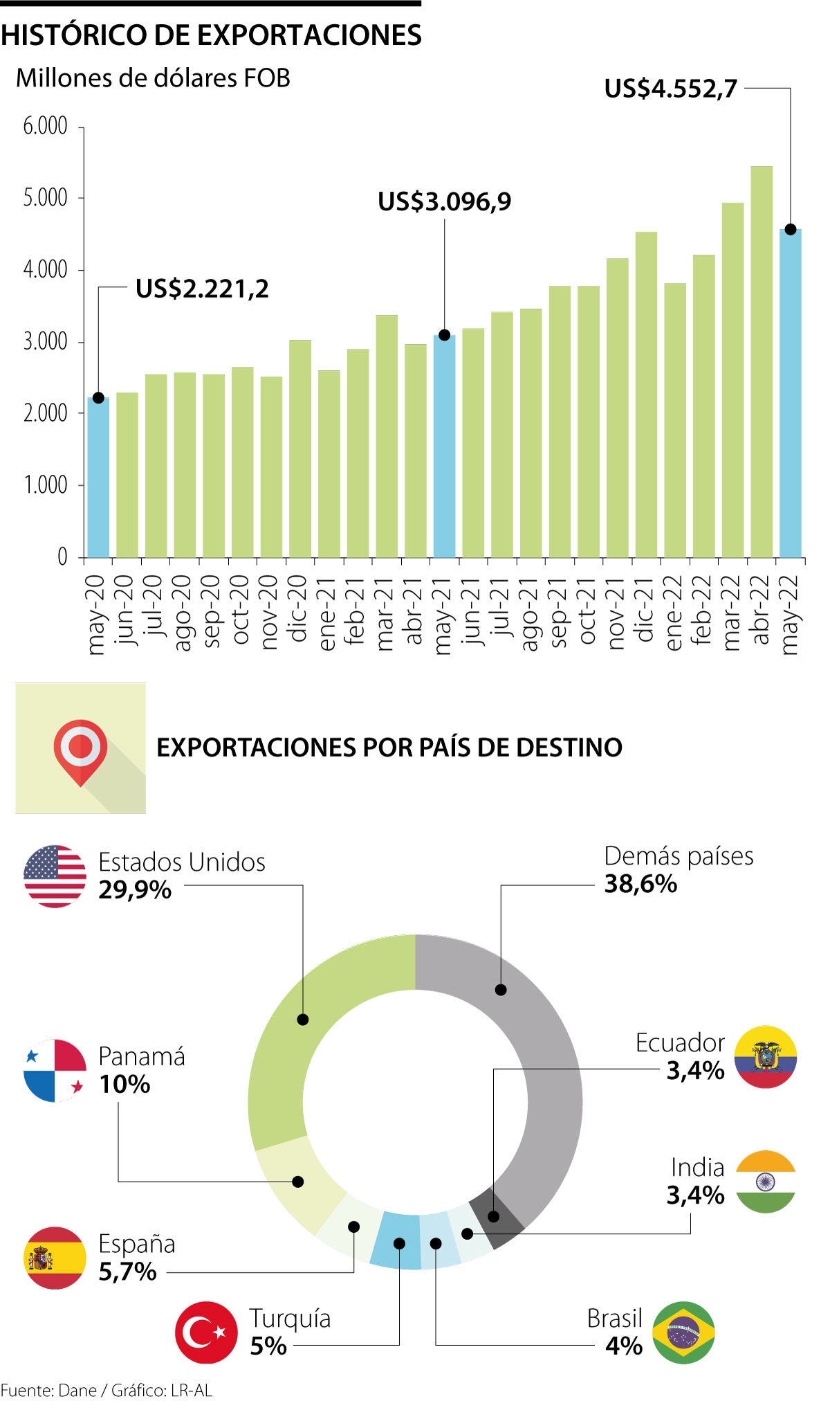 El Dane reveló en su último informe consolidado junto a la Dian que las exportaciones para mayo de 2022 alcanzaron US$4.552,7 millones FOB y tuvieron un crecimiento de 47% si se compara con el mismo mes del año pasado.