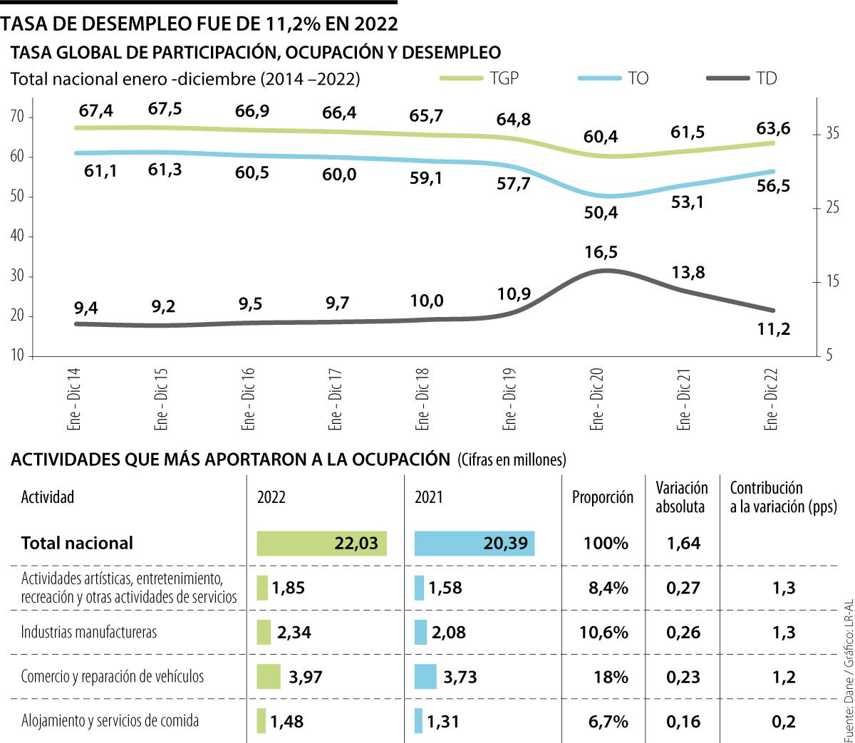 Según los datos revelados por el Dane ayer, en 2022 se crearon, o reabrieron, cerca de 1,64 millones de empleos, y la cantidad de personas ocupadas en el país pasó de 20,39 millones en 2021 a más de 22,03 millones en 2022.