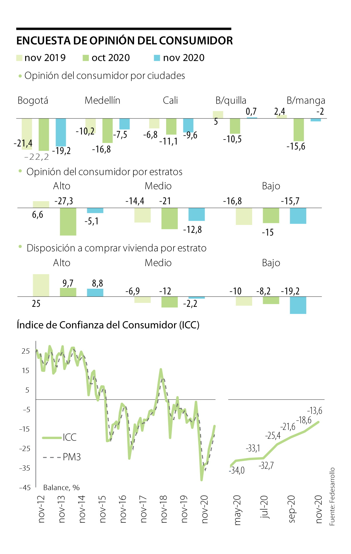 Otro de los resultados de la EOC muestra que, por estratos, la confianza mejoró en los niveles medio y alto, pasando de estar en -21% en octubre a -12,8% en noviembre y de -27,3% en octubre a -5,1% en noviembre, respectivamente.