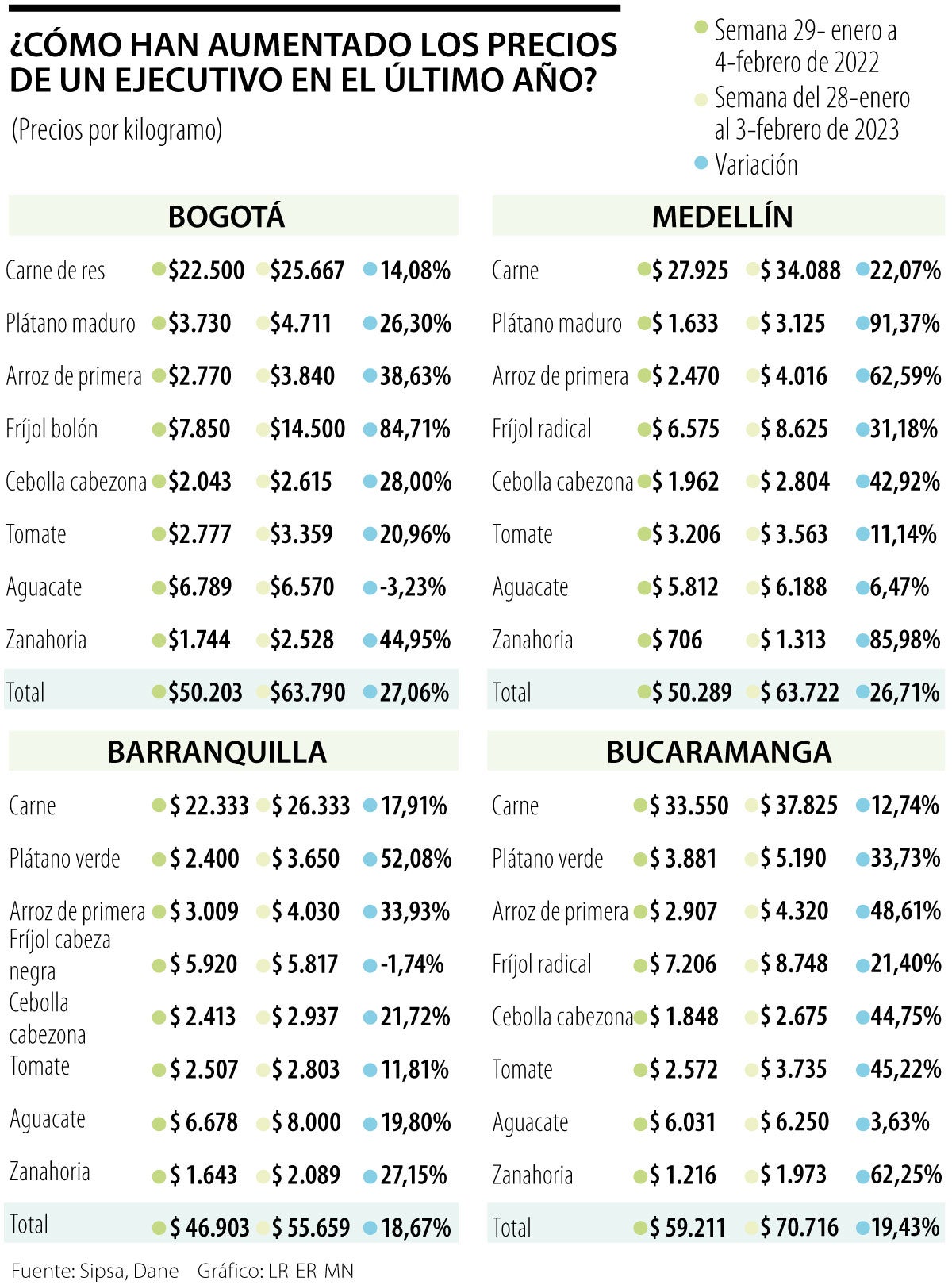 Para hacer este cálculo, LR tomó los precios de los alimentos básicos para hacer un corrientazo en diferentes centrales de abasto en Bogotá, Medellín, Barranquilla y Bucaramanga, tales como carne de res, plátano, arroz, fríjol, cebolla, tomate, aguacate y zanahoria.