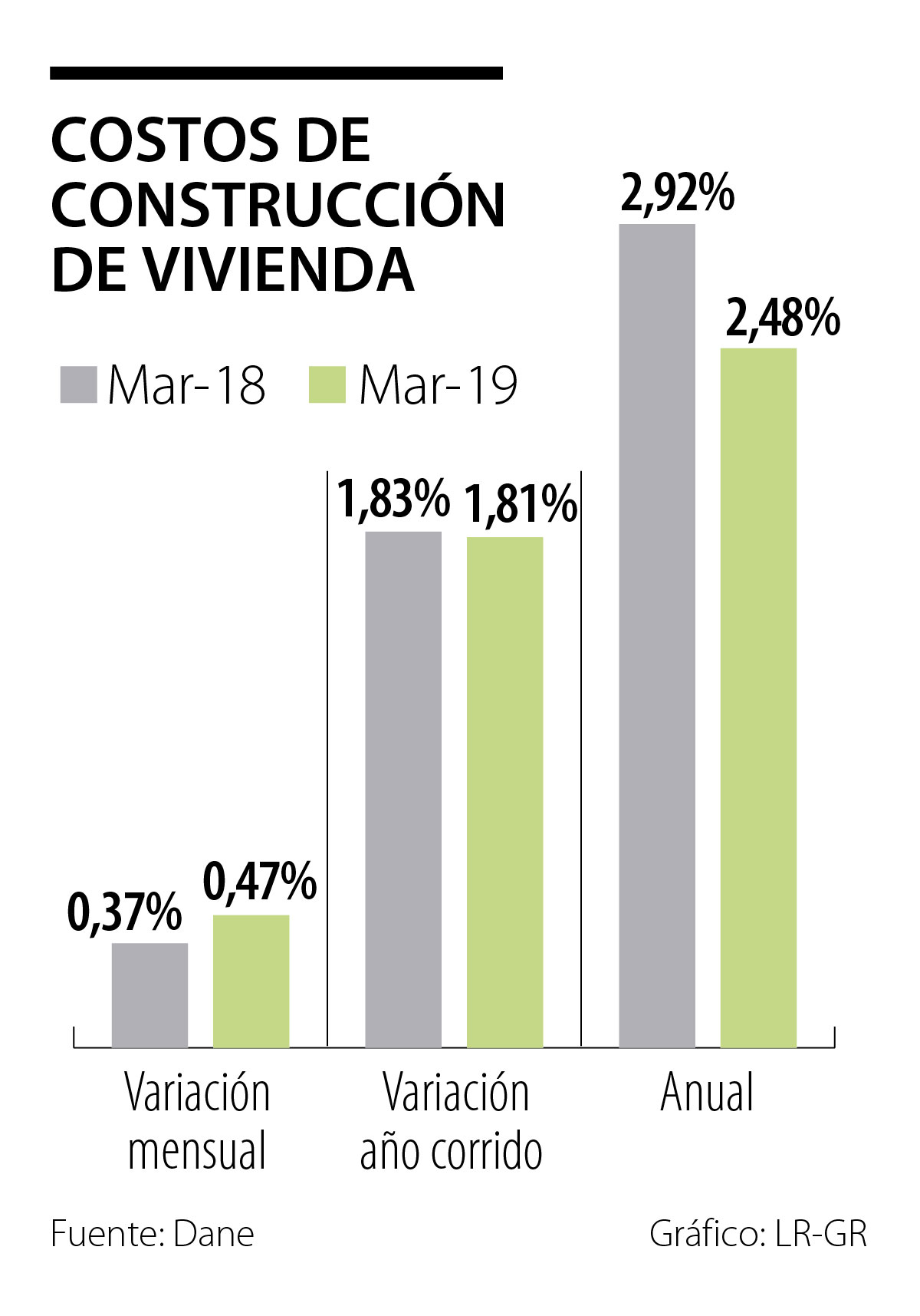 n el tercer mes del año, el Departamento Administrativo Nacional de Estadística (Dane) informó que los costos de construcción en vivienda reportaron una variación anual de 2,48% en comparación con marzo de 2018, cuando la variación en el indicador que mide el rango de precios de los constructores de vivienda aumentó 2,92%.