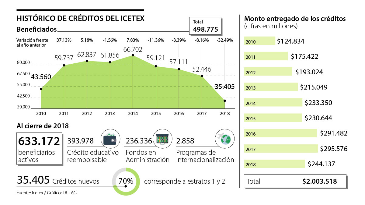 Entre 2010 y 2018 el Icetex giró más de $2 billones en créditos que beneficiaron a 498.775 jóvenes. Tan solo el año pasado 35.405 colombianos accedieron a un crédito nuevo con el Icetex, y de acuerdo con la entidad, 70% de ellos pertenece a estratos 1 y 2.