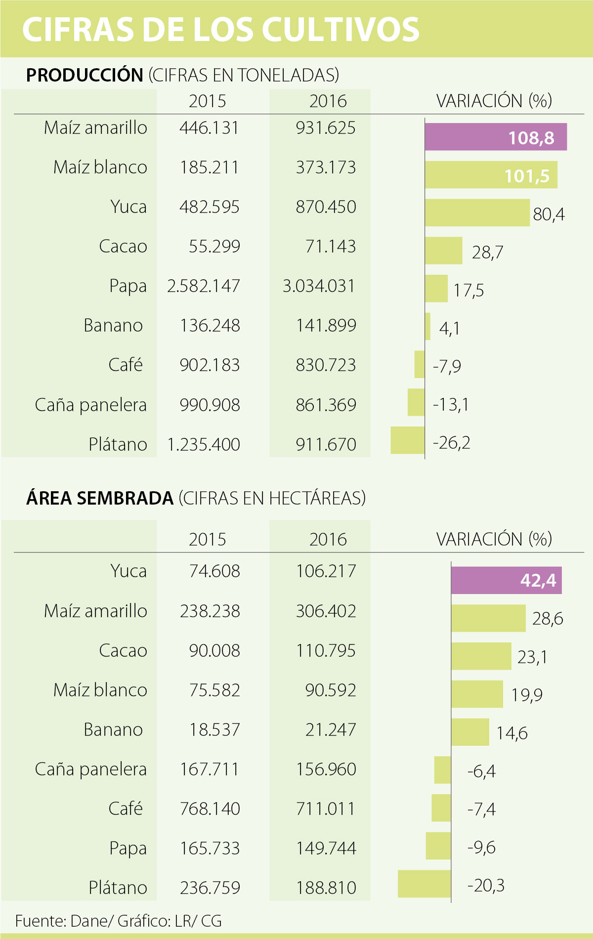 El cultivo de yuca también presentó incrementos. Pasó de 482.595 producidas en 2015 a 870.450 toneladas a 2016. Una variación de 80,4%. De la misma forma, el cacao creció 28,7% en producción y 23,1% en área cultivada. Comportamientos que podrían estar más relacionado, en el caso de la yuca, con el consumo natural del producto y en cacao con la dinámica importante que está adquiriendo en exportaciones, según Bedoya.