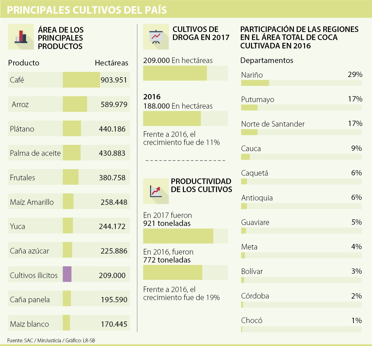 Por encima de los cultivos ilícitos están además el plátano, la palma de aceite, las frutas, el maíz amarillo, la yuca y la caña de azúcar. Sin embargo, para Jorge Bedoya, presidente de este gremio, es sorprendente el hecho de que el territorio dedicado a actividades ilegales sea mayor que de productos como la papa, el maíz blanco y la caña de panela.