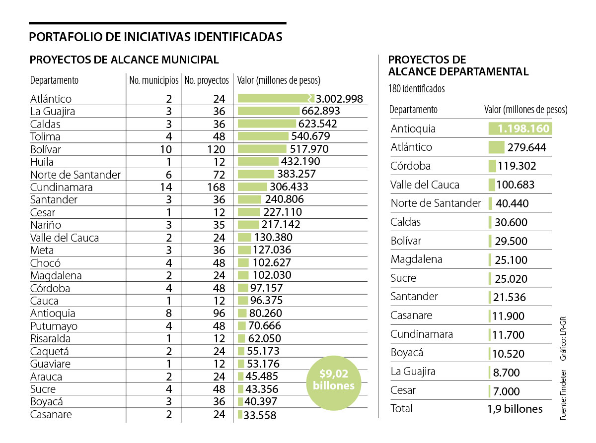 Por otro lado, según las investigaciones adelantadas por este banco de segundo piso, los departamentos donde más están interesados en impulsar proyectos de alcance municipal, en cuanto a cantidad, son Cundinamarca, con 168 iniciativas identificadas; Bolívar, con 120; Antioquia, con 96; y Norte de Santander, con 72. Así, ejecutar ese paquete de proyectos sumaría $1.287 millones, sin contar los otros 611 proyectos que se ofrecerán para otros 51 municipios de 21 departamentos. En cuanto a la visión general propuesta, en el sector que más se ha identificado necesidad de impulsar iniciativas es en aspectos de desarrollo comunitario, con 287 proyectos; seguida por el transporte con 182 iniciativas.