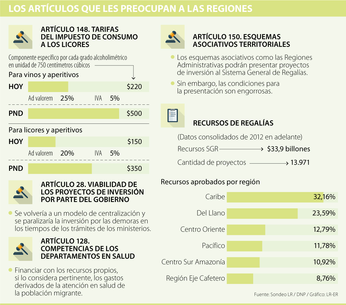 Las críticas de las regiones sobre el Plan Nacional de Desarrollo van desde la entrega de la viabilidad de los proyectos regionales al Gobierno, hasta la cantidad de trámites que aparecen para acceder a los recursos de inversión del Sistema General de Regalías o la iniciativa de aplicar una tarifa única por grado de alcohol para los licores y otra para los vinos.