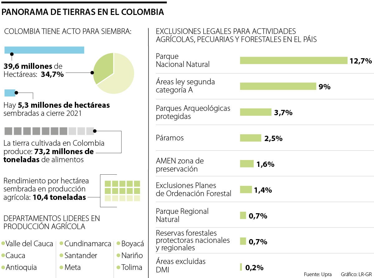 Según cifras de la Unidad de Planificación Rural Agropecuaria (Upra), Colombia tiene apta para siembra cerca de 39,6 millones de hectáreas de tierra, casi 34% del total, sin contar las exclusiones legales para actividades agrícolas, pecuarias y forestales, como los páramos (2,5%), parques nacionales naturales (12,7%), parques regionales naturales (0,7%), parques arqueológicos protegidos (3,7%), áreas ley segunda categoría A (9%), reservas forestales protectoras nacionales y regionales (0,7%), las zonas de preservación (1,6%), exclusiones de los planes de ordenación forestal (1,4%) y las áreas excluidas DMI (0,2%).