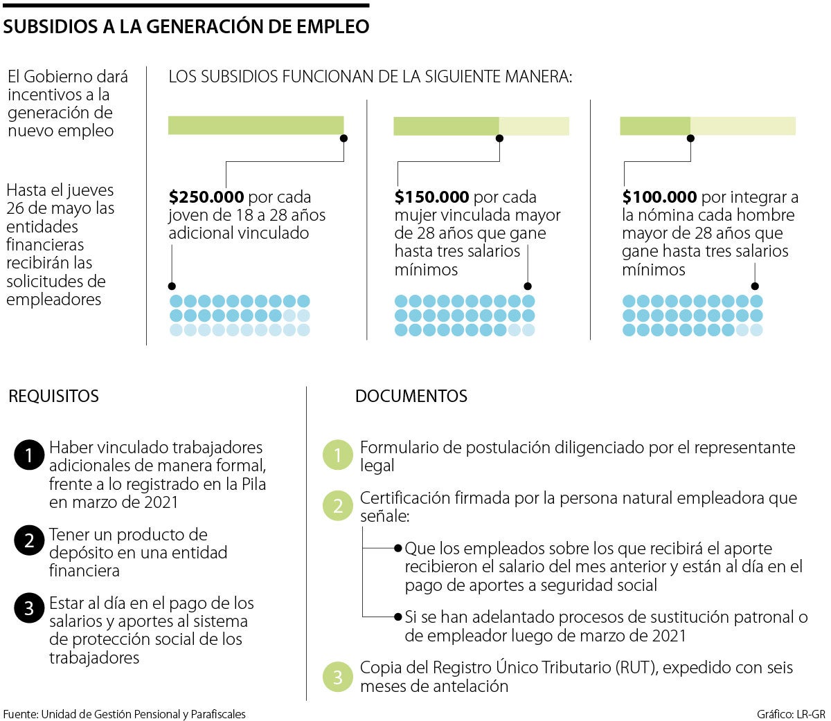 La Ugpp establece que por cada joven de 18 a 28 años que se haya vinculado adicionalmente, el Gobierno subsidiará $250.000 del salario. Además, por cada mujer mayor de 28 años que gane hasta tres salarios mínimos, el empleador recibirá $150.000 en materia de subsidio. Por último, cada hombre mayor de 28 años que devengue hasta tres salarios mínimos generará que a su empleador se le otorgue una ayuda económica de $100.o00.