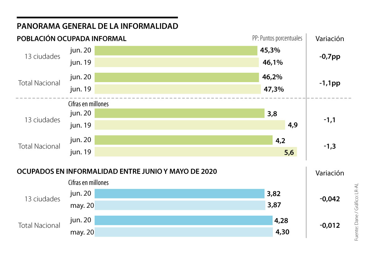 En el sexto mes del año, los niveles de informalidad marcaron 46,2%, lo que significó una caída de 1,1 puntos porcentuales, frente a junio de 2019. En términos cuantitativos la cantidad de ocupados informales que se observó en el país fue 4,28 millones, sin embargo, al comparar esta cifra con la de mayo; mes en el que las condiciones económicas eran muy similares por el aislamiento, se evidenció que los ocupados sin prestaciones sociales se estancaron e incluso hubo una leve caída, pues en el mes pasado la cantidad de esta población fue de 4,3 millones, es decir, casi 12.000 puestos menos.