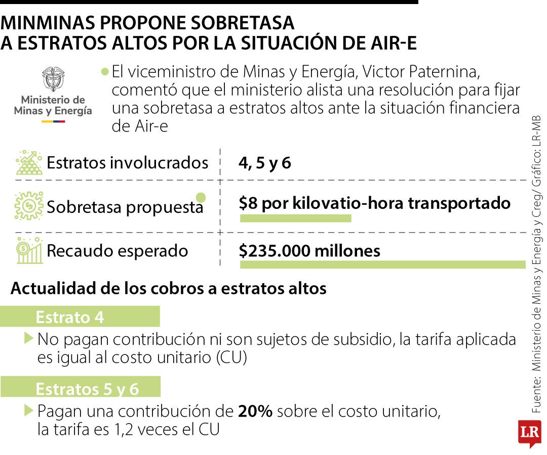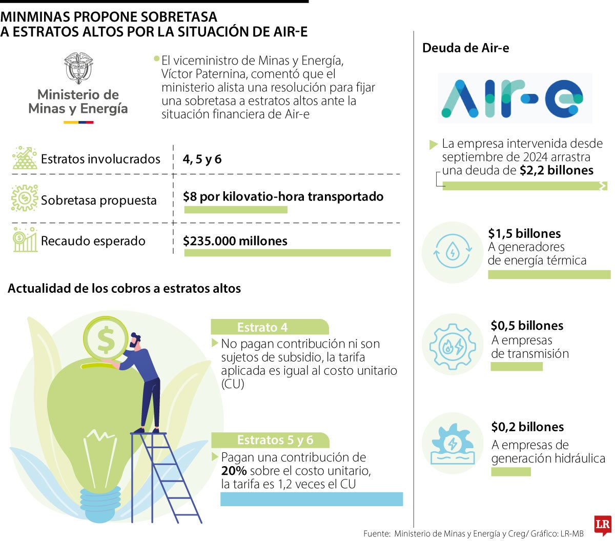 El Ministerio de Minas y Energía anunció que prepara una resolución para reglamentar el cobro de una sobretasa de $8 por kilovatio hora transportado a los estratos altos, como una medida para aliviar la crisis financiera que atraviesa Air-e.