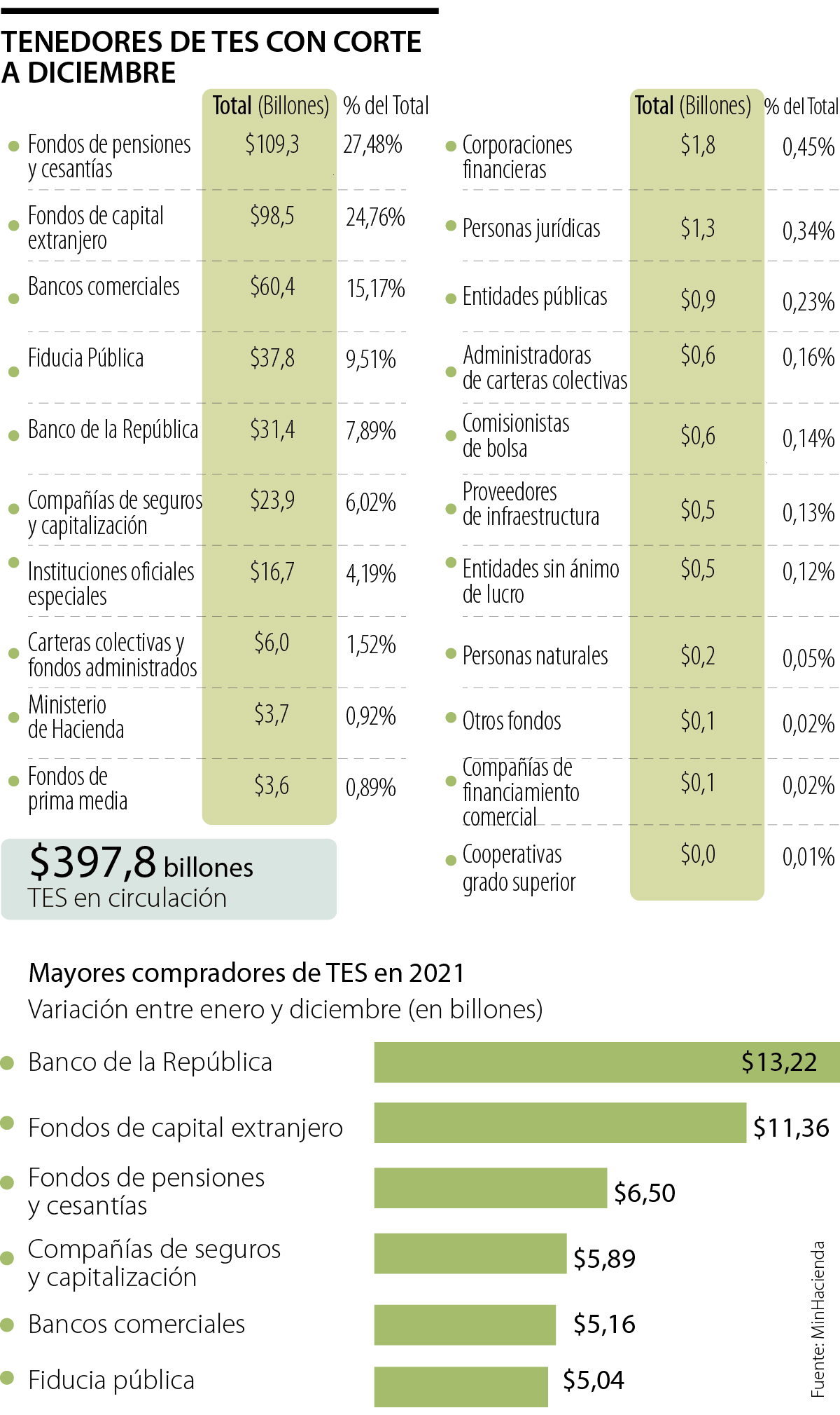 La cifra de compras solo la supera el Banco de la República, que en lo corrido del año pasado adquirió un valor neto de TES de $13,22 billones, cerrando 2022 con un total de $31,4 billones.