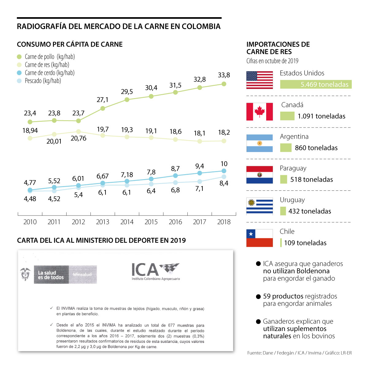 Las explicaciones de los gremios se dieron luego de que se argumentó que en el país se utilizaba esta práctica para aumentar la masa muscular no solo de las vacas, sino hasta de los pollos. La Federación Colombiana de Ganaderos (Fedegan) advirtió que en más de 95% de las reses se usa pasto o suplementos naturales para el engorde, una situación que, para ellos, descarta el uso de esteroides.