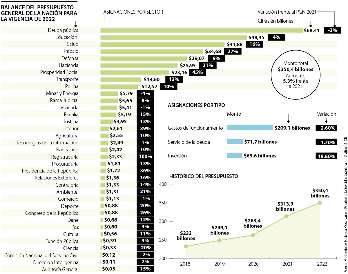 Entre tanto, para los gastos de funcionamiento se contemplaron recursos por $209,1 billones y para el servicio de la deuda el total ascendió a $71,7 billones.