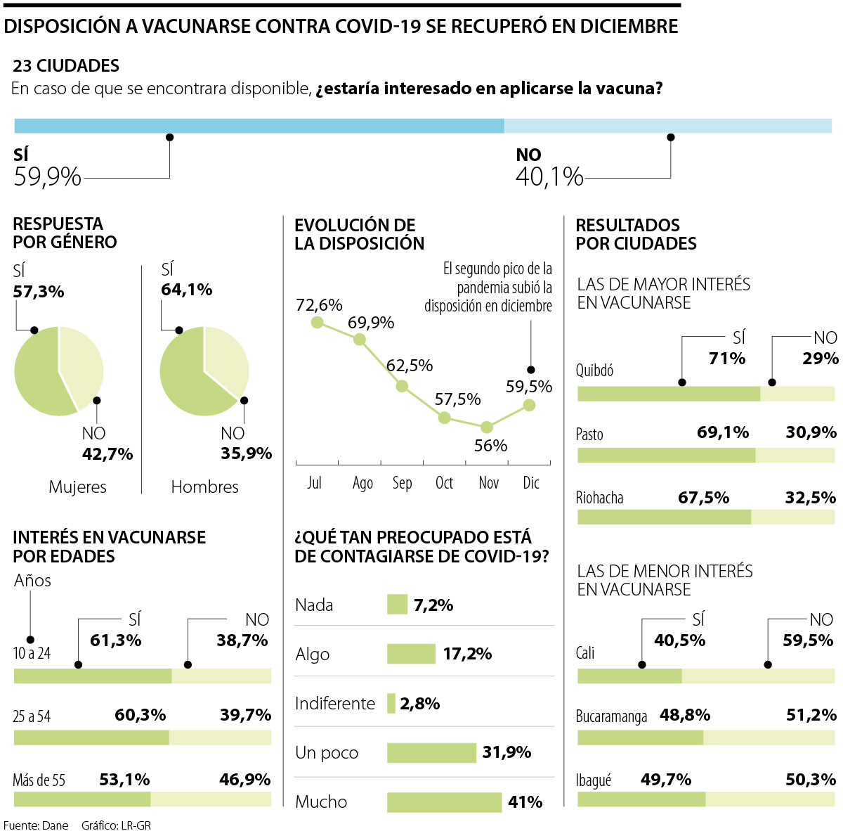 La Encuesta Pulso Social del Dane evidenció que en el acumulado de percepciones del último trimestre de 2020 (octubre-diciembre), los habitantes de Quibdó, Pasto y Riohacha, con 71%, 69,1% y 67,5% de disposición a aplicarse la vacuna, respectivamente, son los de mayor interés en el tratamiento. En Bogotá, 58,9% de los encuestados respondió que sí se vacunaría, mientras que 41,1% dijo que no.