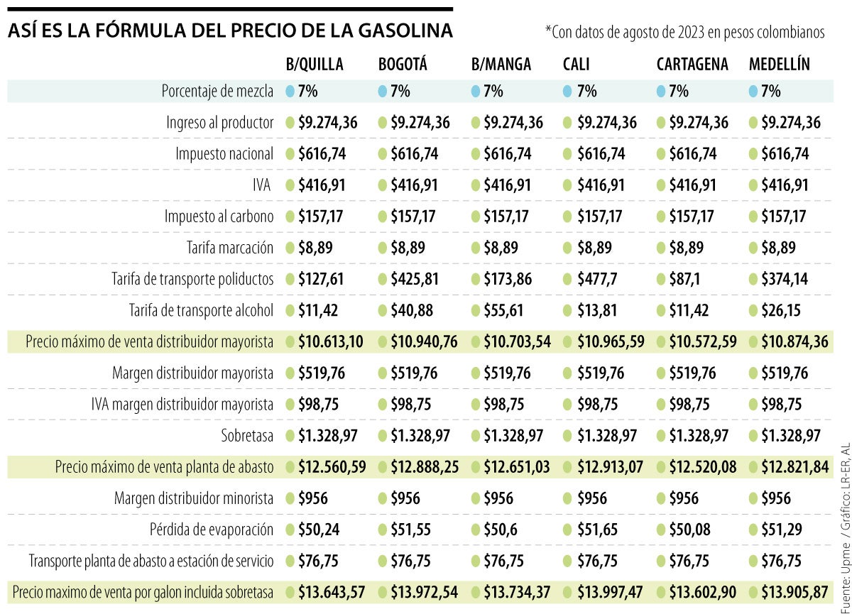 Gremios han pedido hacer una revisión a la fórmula del precio por galón. Según explica Sergio Cabrales, docente de la Universidad de Los Andes y experto en el sector, los tres principales componentes del precio de venta de un galón de gasolina corriente son: el ingreso al productor, los impuestos y la logística de distribución.