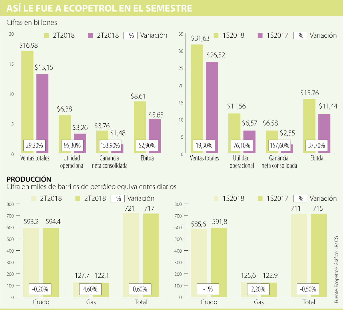 El Ebitda del semestre se situó en $15,76 billones (margen Ebitda de 49,8%), mientras que en el primer semestre de 2017 se registró en $11,45 billones (margen Ebitda 43,2%). El margen logrado en estos seis meses es el más alto de la petrolera en su historia.