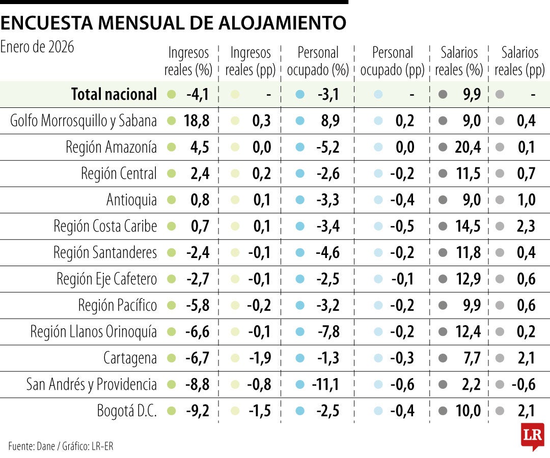 En su más reciente Encuesta Mensual de Alojamiento, EMA, presentada por el Dane, en enero los ingresos reales y el personal ocupado registraron caídas de 4,1% y 3,1%, por su parte, los salarios reales obtuvieron una variación positiva de 9,9%.