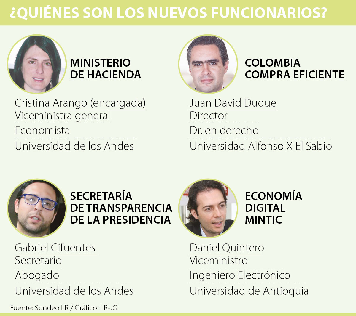 En primer lugar, Santos informó, por medio de su cuenta de Twitter, que el nuevo director de Colombia Compra Eficiente es Juan David Duque Botero y el nuevo Secretario de Transparencia de la Presidencia es Gabriel Cifuentes Ghidini.